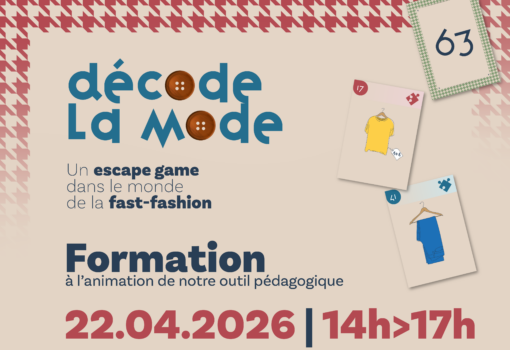 Inscrivez-vous à la formation du 22 avril afin de découvrir et de maîtriser l’animation de notre outil pédagogique « Décode la Mode », l'escape game coopératif qui sensibilise aux enjeux sociaux et environnementaux de la fast-fashion, et repartez avec votre boîte de jeu offerte.