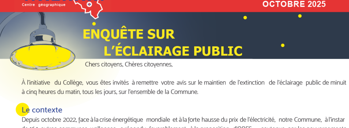 👥 En collaboration avec-Bpact 📂 Enquête publique 📆 2025 📍 Walhain Contexte L'administration communale de Walhain a confié à Citoyenneté & Participation la mission d'élaborer un questionnaire destiné à consulter les habitants sur le maintien de l'extinction nocturne de l'éclairage public entre minuit et 5 h du matin, appliquée quotidiennement sur l'ensemble du territoire communal. … Lire la suite de Enquête sur l'éclairage public